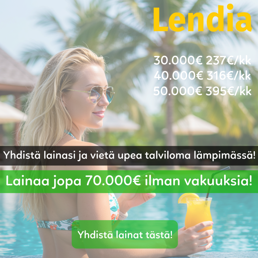 Lendia on kotimainen lainojen yhdistämispalvelu jonka kautta tuhannet tyytyväiset asiakkaat ovat saaneet 20.000€ – 70.000€ kokoisia lainoja ja yhdistelylainoja!
